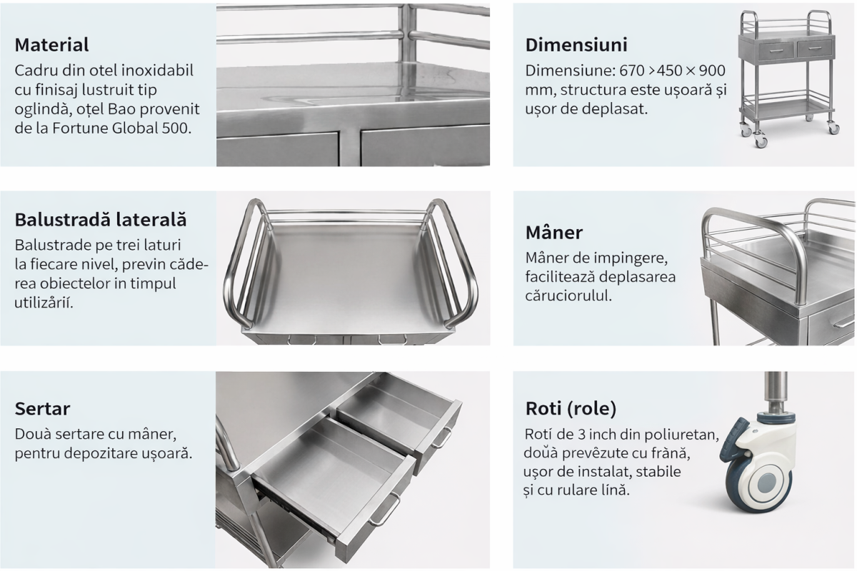 Masa instrumentar inox cu sertare ZET006-1 fabricata din inox cu doua sertare pentru depozitare.