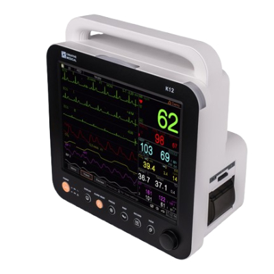 Monitor multiparametric cu ecran tactil K12 pentru pacienti pentru monitorizarea semnelor fiziologice vitale la pacientii adulti, pediatrici si nou-nascuti.