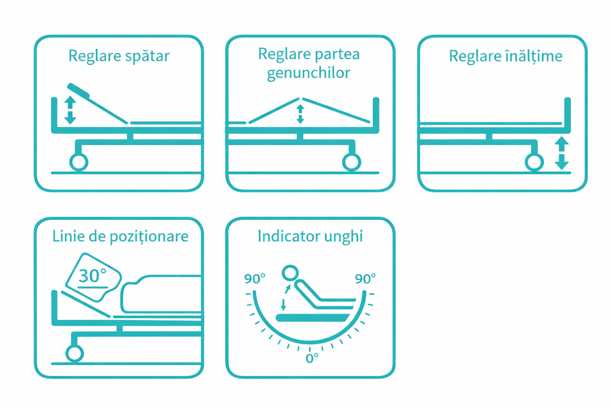Optional: baterie back-up, control pentru asistenta, lumina de noapte, sistem CPR, extensie pat, etc.