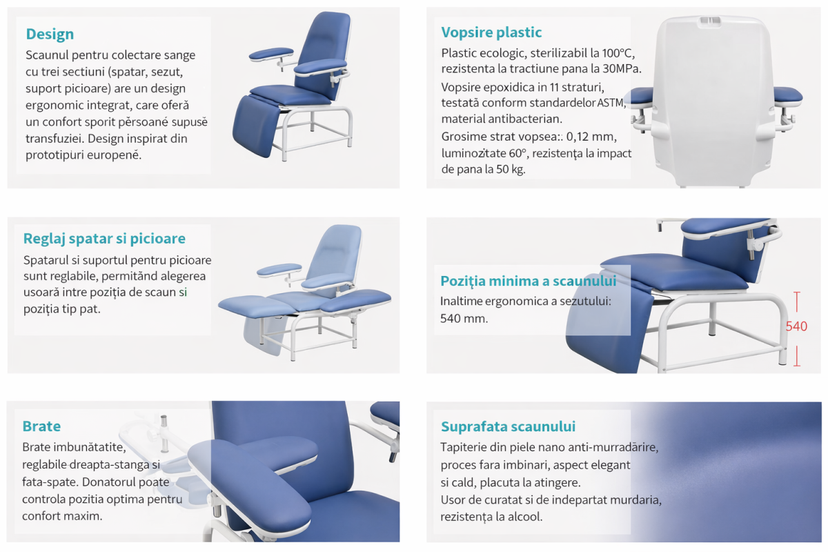 Scaun recoltare sange ZET091 pentru donare/transfuzie sange, ergonomic, reglabil, 3 sectiuni, confort optim pentru pacienti.